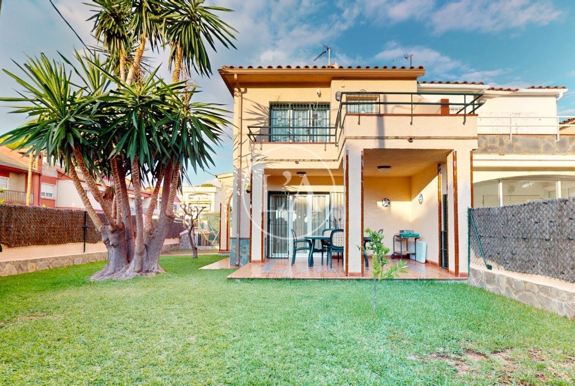 La vivienda, en excelente estado de conservación, ha sido diseñada para ofrecer espacios cómodos y bien conectados con el exterior. En la planta baja, un amplio salón comedor se abre directamente al porche y al jardín privado, creando un ambiente cálido y familiar ideal para disfrutar del clima mediterráneo durante todo el año. El jardín, con césped natural y ducha exterior, ofrece además accesos desde dos calles, una característica poco habitual que aporta gran practicidad y privacidad, perfecta para quienes disfrutan de la vida al aire libre tras un día de playa.