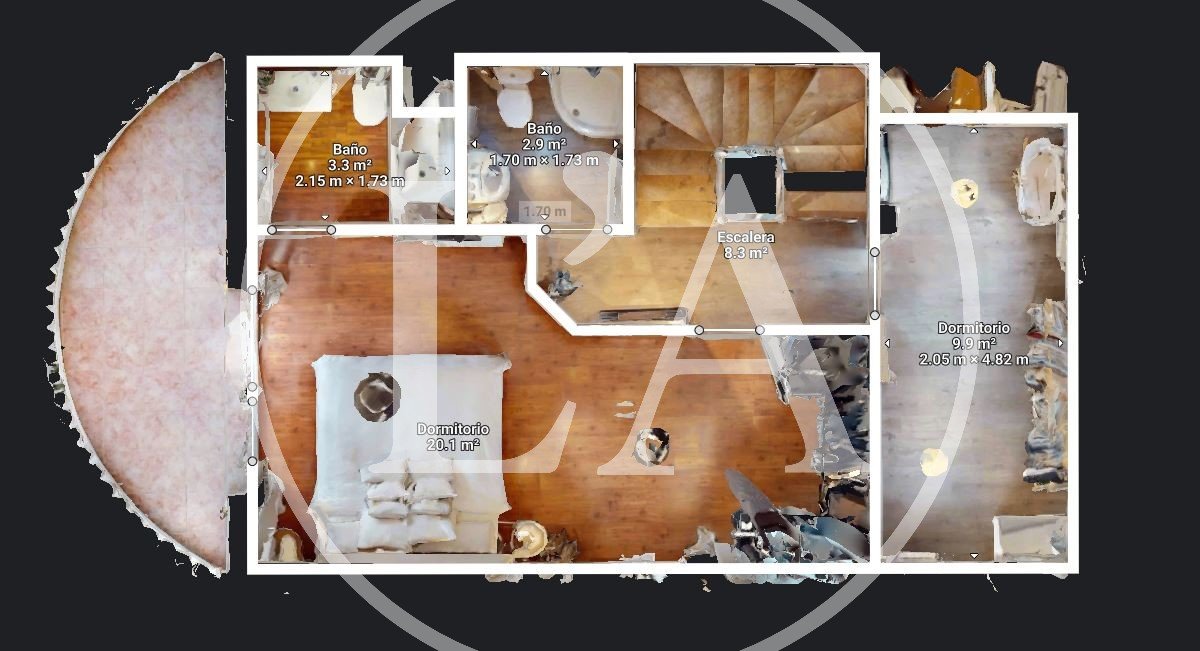 En la primera planta, la distribución original de tres dormitorios se ha modificado para dar lugar a una amplia suite principal, equipada con vestidor, baño completo y salida a una terraza privada. Junto a esta estancia se encuentra un segundo dormitorio individual de buen tamaño y un baño adicional.