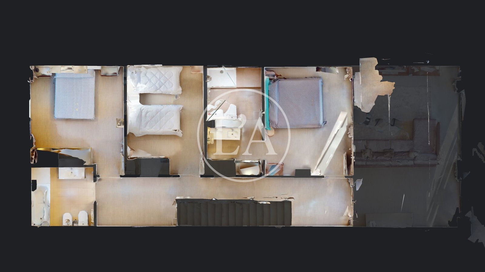 Primera planta. Alberga tres dormitorios dobles, uno de ellos en suite con acceso a una generosa terraza. Esta planta cuenta con dos baños completos: el de la suite y otro con bañera.