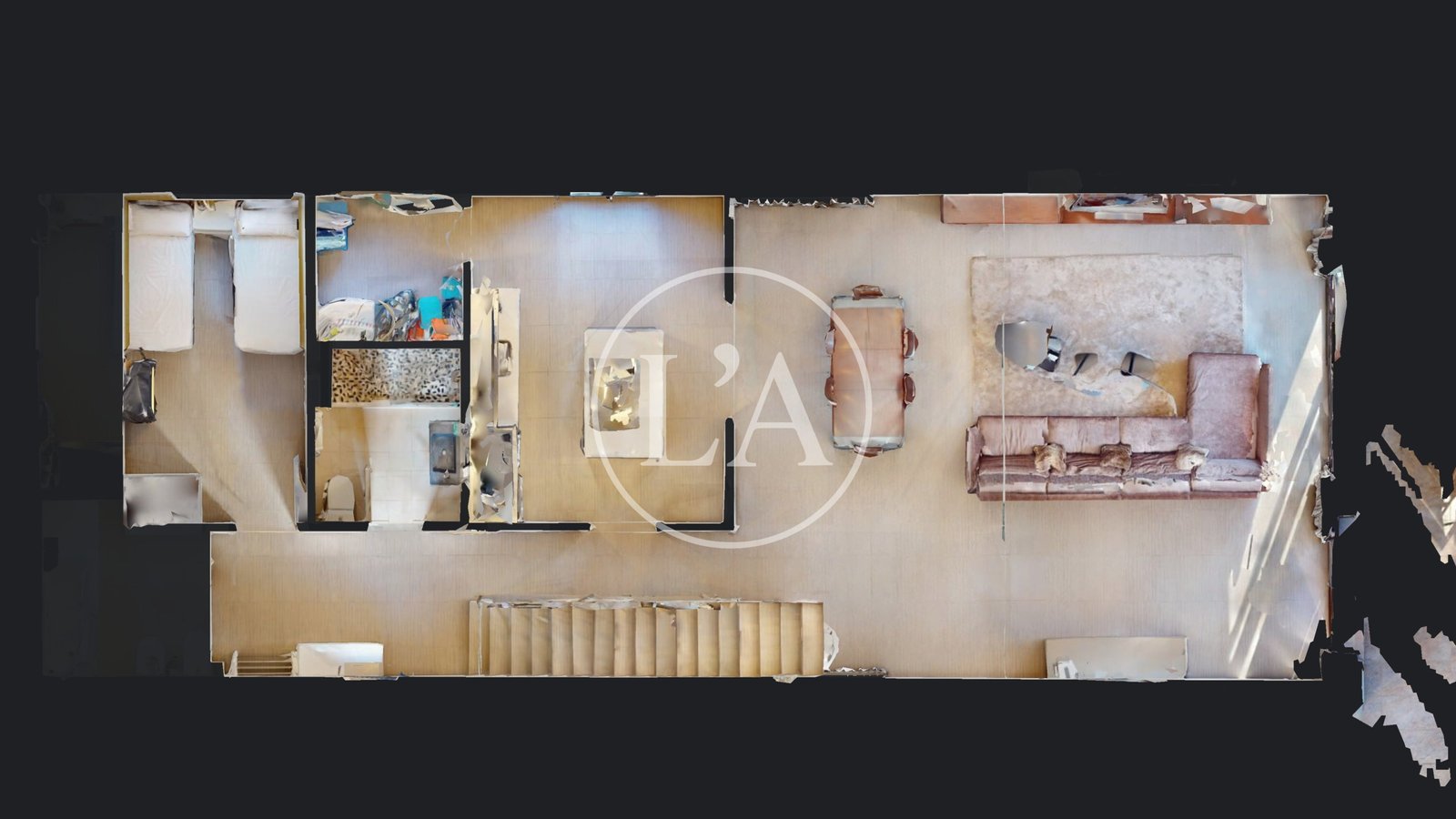 Planta sótano. El garaje, compartido únicamente con la vivienda colindante, dispone de acceso privado mediante escaleras interiores y rampa comunitaria para vehículos, con capacidad para estacionar hasta cinco coches. Un trastero de aproximadamente 20 m² completa esta planta.