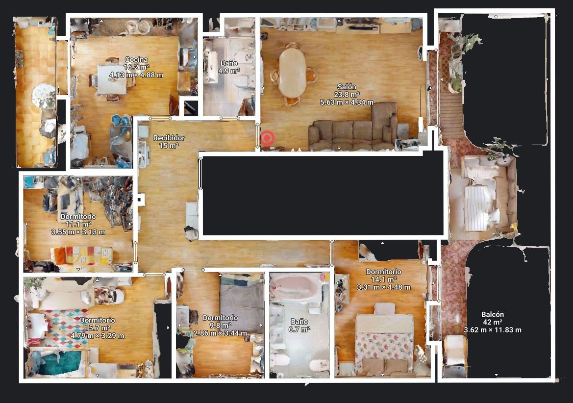 La vivienda cuenta con cuatro dormitorios dobles, todos ellos exteriores. El dormitorio principal se configura como una cómoda suite con baño completo con bañera y salida directa a la terraza principal. Un segundo baño completo con plato de ducha da servicio al resto de las habitaciones.